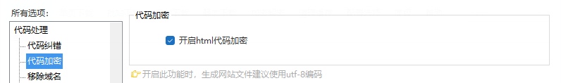 下载生成文件时直接输出加密代码需要配置选项,在软件菜单栏找到:配置选项 > 代码处理 > 代码加密 (勾选)