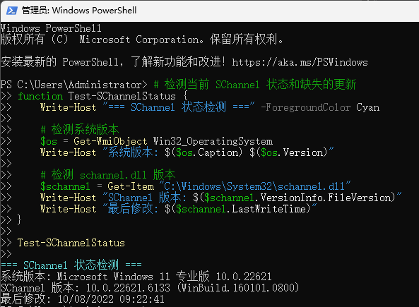 Write-Host "SChannel 版本: $($schannel.VersionInfo.FileVersion)"